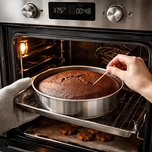Wstaw formę do nagrzanego piekarnika i piecz w 175°C przez 45–55 minut. Sprawdź ciasto patyczkiem po 45 minutach: jeśli patyczek wbity w środek wychodzi czysty lub z kilkoma wilgotnymi okruchami, babka jest gotowa. Jeśli jest na nim surowe ciasto, piecz kolejne 5–10 minut.