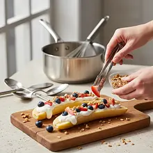 Oto deser, który jest odpowiedzią na odwieczne pytanie rodziców: jak przygotować coś słodkiego, pysznego i jednocześnie zdrowego dla dzieci? Bananowe Łódeczki to fantastyczna, kreatywna przekąska, która nie zawiera ani grama białego cukru! Cała słodycz pochodzi z naturalnie dojrzałych bananów, świeżych owoców i opcjonalnie odrobiny miodu lub syropu klonowego. Podstawą deseru jest banan, który po przekrojeniu i wydrążeniu zamienia się w jadalną miseczkę-łódeczkę. Wnętrze wypełnione jest aksamitnym, gęstym jogurtem greckim, warstwą masła orzechowego dostarczającego zdrowych tłuszczów i białka, a całość wieńczą kolorowe, soczyste owoce. To nie tylko deser, ale również świetna zabawa i okazja do wspólnego gotowania z dziećmi, które mogą same dekorować swoje łódeczki. Danie jest lekkie, orzeźwiające i pełne witamin, idealne na podwieczorek, zdrową przekąskę po szkole czy nawet jako gwiazda dziecięcego przyjęcia urodzinowego.