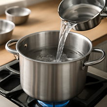 Napełnij średni garnek wodą do 2/3 wysokości (ok. 1–1,2 l). Wstaw na średni ogień i doprowadź do delikatnego wrzenia. Ostrzeżenie: nie dopuszczaj do gwałtownego wrzenia, bo osłonki kiełbasy mogą pękać. Gdy woda zacznie delikatnie wrzeć, włóż kiełbasę (800 g), dodaj 1 liść laurowy i 3 kulki ziela angielskiego. Gotuj na bardzo łagodnym ogniu przez 10–12 minut — małe pęcherzyki powinny delikatnie pielęgnować kiełbasę, nie gwałtowne bulgotanie.