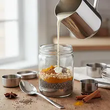 Wstaw owsiankę do lodówki na noc. Po wymieszaniu wstaw zakręcony słoik do lodówki na co najmniej 4 godziny, a najlepiej na całą noc (około 8 godzin). W tym czasie płatki owsiane zmiękną, a nasiona chia napęcznieją, tworząc gęstą, kremową i puddingową konsystencję.