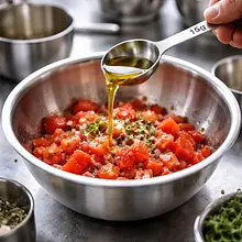 Dodaj do pokrojonych pomidorów 15 g oliwy z oliwek (1 łyżka), drobno posiekany lub przeciśnięty przez praskę 5 g czosnku (1 ząbek), 2 g soli morskiej i 1 g świeżo zmielonego pieprzu. Delikatnie wymieszaj łyżką. Odstaw miskę na bok na 8–10 minut, aby pomidory się 'zmacerowały' — sól i oliwa wydobędą aromaty i lekko skondensują sok. Po 10 minutach delikatnie odlej nadmiar płynu, jeśli powstał.