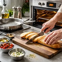 Rozgrzej piekarnik do 200°C (grzanie góra-dół) lub przygotuj patelnię grillową. Pokrój bagietkę ukośnie na plastry grubości 1–1,5 cm (uzyskasz około 10–12 kawałków). Ułóż plastry na blasze do pieczenia wyłożonej papierem lub bezpośrednio na ruszcie; pędzlem rozprowadź na nich pozostałe 15 g oliwy z oliwek (1 łyżka). Wstaw do piekarnika i piecz 5–7 minut aż spód i brzegi będą złociste i chrupiące. Alternatywnie smaż na średnio gorącej patelni po 2–3 minuty z każdej strony.