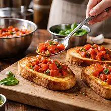 Klasyczna włoska przystawka — bruschetta z pomidorami i bazylią to chrupiące plasterki opieczonej bagietki natartej czosnkiem, podane z aromatycznym, lekko kwaśnym i soczystym farszem z dojrzałych pomidorów, oliwy z oliwek i świeżej bazylii. Potrawa pochodzi z Włoch, gdzie proste, sezonowe składniki ustawiane są w centrum smaku. Idealna jako przekąska na Walentynki — efektowna wizualnie (czerwone pomidory, zielona bazylia, złocisty chleb), charakteryzuje się kontrastem chrupkości i świeżości oraz przyjemnym ziołowo-oliwnym aromatem. Podawać natychmiast po przygotowaniu, z opcją dodatku balsamico, świeżo startym parmezanem lub rukolą dla przełamania smaku.