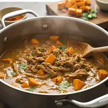 Gdy bataty są już miękkie, dodaj do sosu szarpaną wołowinę oraz odsączoną i opłukaną ciecierzycę. Delikatnie wymieszaj wszystko razem. Gotuj na małym ogniu bez przykrycia przez kolejne 5-10 minut, aby smaki się połączyły, a sos lekko zgęstniał. Na koniec spróbuj i dopraw do smaku solą i pieprzem.