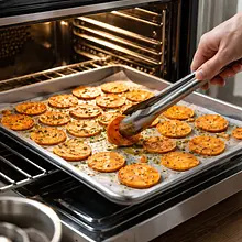 Po upieczeniu wyjmij blachę i pozostaw chipsy na blasze przez 2-3 minuty, aby stężały. Jeśli używasz parmezanu, posyp nim gorące chipsy tuż po wyjęciu — ser lekko się rozpuści i przylepi.
