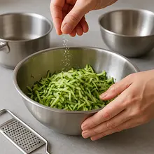 Startą cukinię posyp jedną szczyptą soli i delikatnie wymieszaj dłońmi. Odstaw miskę na 10-15 minut. W tym czasie sól 'wyciągnie' nadmiar wody z warzywa. Po tym czasie zauważysz, że na dnie miski zebrał się płyn. Przełóż cukinię na czystą ściereczkę kuchenną lub gazę, zawiń w sakiewkę i bardzo mocno odciśnij nad zlewem, aż pozbędziesz się jak największej ilości soku. Cukinia powinna stać się znacznie bardziej sucha i zwarta.