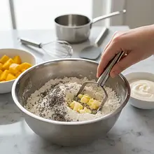 Do miski z suchymi składnikami dodaj masło pokrojone w małą kostkę. Masło musi być bardzo zimne, prosto z lodówki. Używając opuszków palców, szybko rozcieraj masło z suchymi składnikami, aż powstaną grudki przypominające mokry piasek. Pracuj szybko, aby masło się nie roztopiło od ciepła dłoni.