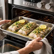 Wstaw blachę z filetami do nagrzanego piekarnika na środkową półkę. Piecz przez 12-15 minut w 200°C (jeśli filety są grubsze -> 15-18 minut). Ryba jest gotowa, gdy powierzchnia zmieni kolor na jednolicie biały/nieprzeźroczysty, a mięso łatwo rozdziela się widelcem na płatki. Sprawdź w najgrubszym miejscu: gdy widelec delikatnie wbity i skręcony powoduje, że mięso „rozpada się” na płatki, oznacza to gotowość. Jeśli masz termometr kuchenny wartość wewnętrzna powinna wynosić ok. 60-63°C.