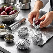 Rozgrzej piekarnik do 200°C. Buraki dokładnie umyj, owiń każdy osobno folią aluminiową lub umieść w naczyniu żaroodpornym z przykrywką. Piecz przez 45–60 minut (w zależności od wielkości) aż widelec wchodzi w nie gładko — powinny być miękkie w środku.