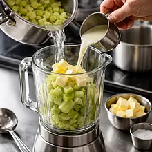 Przełóż odsączony, gorący seler do blendera. Dodaj zimne masło pokrojone na kawałki (50 g) i 100 ml śmietany. Miksuj pulsacyjnie na wysokich obrotach do uzyskania gładkiej, kremowej konsystencji. Jeśli masa jest zbyt gęsta, dodaj stopniowo łyżką wodę z gotowania (z kroku 3), aż osiągniesz gładkie, lekko płynne puree (konsystencja powinna trzymać formę na talerzu, ale dać się rozsmarować). Na koniec dodaj starty chrzan (30 g), szczyptę soli (ok. 1 g) i 1/4 łyżeczki świeżo zmielonego pieprzu (ok. 0.5 g). Wymieszaj krótko ręcznie.