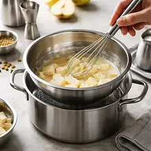 Umyj gruszki pod bieżącą wodą, osusz papierowym ręcznikiem. Obierz skórkę (użyj obieraczki do warzyw), przekrój każdy owoc na pół i usuń gniazda nasienne łyżeczką. Pokrój miąższ na niewielkie kawałki (ok. 1-2 cm). Umieść kawałki gruszki w garnku z grubym dnem wraz z 20 g miodu (wliczone w składniki) i 10 ml soku z cytryny. Podgrzewaj na małym ogniu przez 10-12 minut, mieszając drewnianą łyżką co 2 minuty — gruszki powinny zmięknąć na tyle, że łatwo rozgnieciesz je widelcem. Gdy gruszki są miękkie, przełóż do blendera i miksuj na gładkie puree (ok. 40-60 sekund). Jeśli puree jest zbyt gęste, dodaj po 10 ml wody lub cydru, by uzyskać kremową konsystencję. Przetrzyj puree przez drobne sito (optional, dla wyjątkowo gładkiej struktury) — użyj sylikonowej szpatułki, aby przepchnąć puree przez sito.