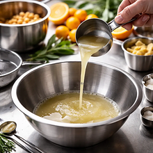 Po 8–10 minutach zdejmij rondel z ognia. Odstaw syrop na 15 minut, aby ostygł i nabrał pełnego aromatu. Następnie przez drobne sito przelej syrop do miski lub butelki: przyciśnij łyżką kumkwaty i plasterki imbiru w sicie, aby oddały jak najwięcej soku i aromatu. Do przestudzonego syropu dodaj 60 ml octu jabłkowego i 350–400 ml świeżo wyciskanego soku pomarańczowego (z kroku 1), wymieszaj i spróbuj — smak powinien być słodko-kwaskowy i wyraźnie imbirowy. Jeśli jest za kwaśny, dodaj do smaku 1–2 łyżeczki cukru; jeśli zbyt słodki, dodaj 1 łyżkę octu więcej.