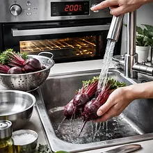 Użyj rękawic kuchennych do wyjęcia gorących buraków i ostrożnie rozwiń folię (uwaga na parę). Najlepiej piec buraki o podobnej wielkości razem, by równomiernie się upiekły. Jeśli chcesz przyspieszyć, możesz pokroić buraki na ćwiartki i piec 35-40 minut.