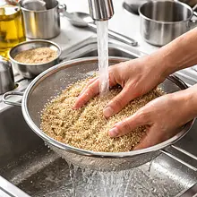 Użyj garnka z pokrywką; jeśli nie masz sitka drobno oczkowego, przepłucz komosę kilkukrotnie w misce. Gotowanie na zbyt dużym ogniu lub bez przykrycia powoduje nierównomierne wchłanianie wody.
