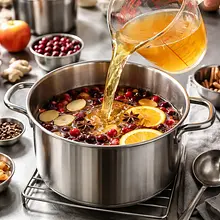 Tradycyjny, sezonowy gorący cydr korzenny łączący słodycz pieczonych jabłek, kwaskowość żurawiny i intensywne aromaty cynamonu, anyżu i goździków. To rozgrzewający napój idealny na chłodne popołudnia i wieczory — pięknie prezentuje się w przezroczystych szklankach z plasterkiem pomarańczy i laską cynamonu. Można go podać jako bezalkoholowy napój świąteczny lub dodać odrobinę prawdziwego cydru jabłkowego/rumu tuż przed podaniem. Estetycznie przyciąga wzrok dzięki głębokiej czerwono-pomarańczowej barwie i dekoracjom, a smakowo łączy nuty karmelizowanych owoców, przypraw korzennych i świeżej cytryny.
