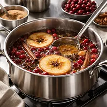 Podgrzewaj na średnim ogniu do momentu, gdy płyn zacznie się delikatnie gotować (małe bąbelki przy brzegach). Zmniejsz ogień do niskiego i gotuj na bardzo łagodnym ogniu przez 12–15 minut — celem jest wydobycie aromatów przypraw i miękkość żurawiny, nie intensywne wrzenie.