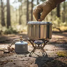 Podawaj danie na gorąco, bezpośrednio z menażki lub garnka, w którym było gotowane - to część biwakowego klimatu. Najlepiej smakuje z kromką chleba na zakwasie lub chrupkim pieczywem, którym można wytrzeć resztki pysznego, gęstego sosu. Jeśli zabrałeś ze sobą suszoną pietruszkę, możesz posypać nią danie dla odrobiny koloru i świeżości.
