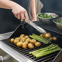 Ułóż zamarynowane ziemniaki i szparagi bezpośrednio na rozgrzanym ruszcie. Szparagi najlepiej układać w poprzek prętów rusztu, aby nie wpadły do środka. Grilluj ziemniaki przez około 10-15 minut, obracając je co kilka minut, aż będą gorące w środku i będą miały wyraźne, ciemne ślady od rusztu. Szparagi potrzebują mniej czasu, około 5-7 minut. Obracaj je w połowie grillowania. Powinny być delikatnie zwęglone, ale wciąż jędrne i chrupiące.