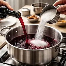 W szerokim, żaroodpornym rondlu (min. 24 cm średnicy) wlej czerwone wino (500 ml). Dodaj cukier (150 g), miód (60 g), laski cynamonu (2 szt., czyli 6 g) oraz startą skórkę z pomarańczy (6 g). Podgrzewaj na średnim ogniu, mieszając drewnianą łyżką, aż cukier się rozpuści (ok. 4-6 minut). Gdy mieszanina zacznie lekko pyrkać, zmniejsz ogień do małego i gotuj delikatnie przez 10 minut — sos powinien lekko odparować i nabrać intensywnego aromatu. Na koniec dodaj sok z cytryny (30 ml) i wymieszaj.