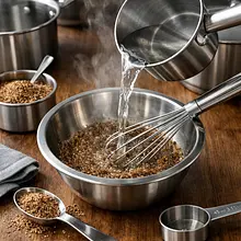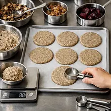 Przygotuj 'żel' z siemienia: zmieszaj 15 g mielonego siemienia lnianego z 45 ml gorącej wody (3× więcej wody niż siemienia), odstaw na 5 minut aż zgęstnieje. Do dużej miski włóż ugotowaną kaszę (200 g ugotowanej kaszy — tu używamy wcześniej ugotowanej porcji), dodaj 200 g pieczonych i przestudzonych plasterków buraka pokrojonych drobno, 80 g zmielonych płatków owsianych, 200 g podsmażonych grzybów z cebulą (całość z kroku 3) oraz żel lniany. Dopraw 2 g soli i 1 g pieprzu. Wymieszaj energicznie łyżką — masa powinna być plastyczna, lekko lepka i dawać się formować w kulki; jeśli jest zbyt sucha, dodaj 1–2 łyżki (15–30 ml) wody; jeśli zbyt luźna, dodaj 10–20 g płatków owsianych.