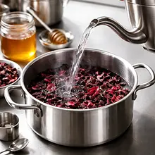 Zalej suszone kwiaty hibiskusa gorącą wodą (ok. 1000 ml) w dzbanku. Jeśli używasz laski cynamonu (opcjonalnie), włóż ją teraz do dzbanka. Przykryj dzbanek pokrywką lub talerzykiem, aby utrzymać temperaturę.