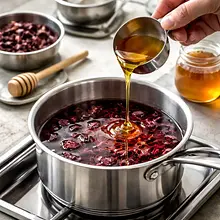 Dodaj miód (60 g) do gorącego, ale nie wrzącego naparu. Odczekaj 2–3 minuty po odcedzeniu / przelaniu, tak aby temperatura naparu spadła nieco (do ok. 60°C), a następnie dodawaj miód po łyżce, mieszając drewnianą łyżką lub małą łopatką do rozpuszczenia. Skosztuj i dopasuj słodkość.