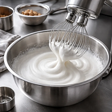 Chłodna miska ze stali nierdzewnej i zimne końcówki miksera pomogą szybciej ubić aquafabę. Wlej 60 ml aquafaby do miski, dodaj szczyptę soli i 15 g syropu klonowego (1/2 łyżki) jako stabilizatora i zacznij ubijać na średnio-wysokich obrotach. Po 2-3 minutach zwiększ obroty i ubijaj dalej przez 3-5 minut, aż powstanie jasna, błyszcząca i lekko sztywna piana — powinna utrzymywać kształt przy odwróceniu łyżki, ale być nadal kremowa.