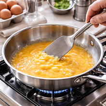 Wlej masę jajeczną na patelnię równomiernie. Po 10-15 sekundach, gdy brzegi zaczną się ścinać, używając silikonowej szpatułki lub drewnianej łyżki delikatnie zepchnij ścięte brzegi do środka, prowadząc ruch od krawędzi ku środkowi. Powtarzaj ten ruch co 10-20 sekund, tworząc duże, miękkie skrzepy. Smaż łącznie około 4-6 minut na bardzo niskim ogniu, cały czas kontrolując konsystencję; chcesz uzyskać kremowe, lekko wilgotne skrzepy. Gdy masa jest prawie ścięta, ale wciąż lekko błyszcząca, zdejmij patelnię z ognia — jajecznica dojdzie jeszcze przez 30-60 sekund od ciepła resztkowego.