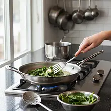 Teraz przygotuj szpinak. Na średniej wielkości patelni rozpuść połowę masła (około 7-8g) na średnim ogniu. Gdy masło zacznie się pienić, dodaj posiekany czosnek i smaż przez około 30 sekund, aż zacznie pachnieć. Uważaj, aby go nie przypalić. Następnie dodaj umyty i osuszony szpinak. Smaż, mieszając od czasu do czasu, przez 2-3 minuty, aż liście zwiędną i znacznie zmniejszą swoją objętość. Zdejmij patelnię z ognia, dopraw szpinak szczyptą soli i pieprzu. Odciśnij nadmiar wody, delikatnie dociskając szpinak łyżką do dna patelni.