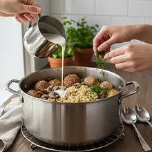 Oto kwintesencja domowego, komfortowego jedzenia – soczyste klopsiki z indyka zapieczone w aksamitnym, kremowym sosie grzybowym z dodatkiem pożywnej kaszy pęczak i słodkich warzyw korzeniowych. To danie, które gotuje się praktycznie samo w jednym naczyniu, wypełniając kuchnię niesamowitym aromatem. Inspirowane ideą prostoty i pełni smaku, łączy w sobie delikatność mięsa indyczego, ziemiste nuty pieczarek i opcjonalnie borowików, słodycz marchewki i pasternaku oraz charakterystyczną, lekko orzechową kaszę pęczak, która wspaniale wchłania smak sosu. Danie jest nie tylko sycące i rozgrzewające, ale również pięknie prezentuje się na stole, z zielonymi akcentami świeżego koperku. Idealne na rodzinny obiad w chłodny dzień, elegancką kolację bez zbędnego stresu czy po prostu wtedy, gdy masz ochotę na coś naprawdę pysznego i odżywczego prosto z piekarnika.