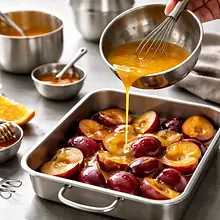 Gdy śliwki są upieczone (krok 2), wyjmij naczynie z piekarnika i delikatnie przelej powstały syrop do małego rondelka. Postaw na małym ogniu i gotuj 2–3 minuty, aż syrop lekko się zredukuje. Jeśli chcesz intensywniejszej konsystencji, dodaj dodatkowe 10–15 g miodu i gotuj krócej.