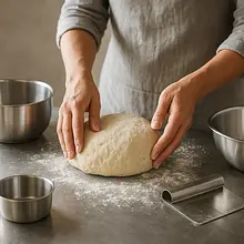 Przełóż ciasto na lekko oprószony mąką blat kuchenny lub stolnicę. Rozpocznij wyrabianie. Zagarniaj ciasto od spodu, składaj na pół i dociskaj nasadą dłoni, odpychając je od siebie. Obróć ciasto o 90 stopni i powtórz czynność. Wyrabiaj ciasto energicznie przez około 10-12 minut. Gotowe ciasto powinno być gładkie, elastyczne i sprężyste. Gdy naciśniesz je palcem, wgłębienie powinno powoli wracać do pierwotnego kształtu. Ciasto nie powinno już kleić się do rąk.