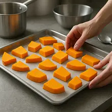 Wyłóż dużą blachę do pieczenia papierem do pieczenia. Rozłóż na niej kawałki dyni w jednej warstwie, upewniając się, że nie zachodzą na siebie. Wstaw blachę do rozgrzanego piekarnika i piecz przez 20-25 minut. Dynia jest gotowa, gdy widelec wchodzi w nią z łatwością, a jej krawędzie są lekko zrumienione i skarmelizowane. Po upieczeniu wyjmij blachę z piekarnika i odstaw dynię do lekkiego przestygnięcia.