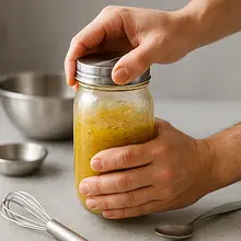 Mocno zakręć słoik i energicznie nim potrząsaj przez około 20-30 sekund. Zobaczysz, jak oliwa i ocet, które początkowo były oddzielone, połączą się w gładką, jednolitą emulsję o lekko kremowej konsystencji. To znak, że sos jest gotowy. Odstaw go na bok.