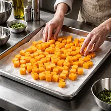 Wyłóż dużą blachę do pieczenia papierem do pieczenia. Rozłóż na niej kostki dyni w jednej warstwie, upewniając się, że kawałki się nie stykają. Wstaw blachę do nagrzanego piekarnika i piecz przez 20-25 minut. Dynia jest gotowa, gdy widelec z łatwością wchodzi w miąższ, a brzegi kostek są lekko zrumienione i skarmelizowane. Po upieczeniu wyjmij blachę z piekarnika i odstaw dynię do lekkiego przestudzenia.