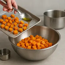 Przełóż pokrojoną w kostkę dynię do dużej miski. Polej ją jedną łyżką oliwy z oliwek (ok. 15 ml), dopraw solą i świeżo mielonym pieprzem. Dokładnie wymieszaj rękoma, tak aby każdy kawałek dyni był równomiernie pokryty oliwą i przyprawami. Rozłóż dynię w jednej warstwie na przygotowanej blasze. Piecz przez 20-25 minut, aż dynia będzie miękka i lekko zrumieniona na brzegach.