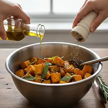 Do miski z dynią dodaj 2 łyżki (30g) oliwy z oliwek, dwie szczypty soli (2g) i jedną szczyptę pieprzu (1g). Dokładnie wymieszaj dłońmi lub dużą łyżką, tak aby każdy kawałek dyni był pokryty cienką warstwą oliwy i przypraw. Wyłóż dużą blachę do pieczenia papierem i rozłóż na niej dynię w jednej warstwie.