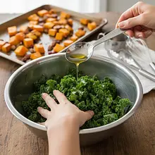 To kluczowy krok, aby surowy jarmuż był smaczny. Do miski z jarmużem dodaj 1 łyżkę (15g) oliwy z oliwek i szczyptę soli (1g). Następnie, przez 1-2 minuty, masuj liście dłońmi, ugniatając je, jakbyś wyrabiał ciasto. Zauważysz, że jarmuż zmieni kolor na ciemniejszy, zmniejszy swoją objętość i stanie się znacznie bardziej miękki i delikatny w smaku.