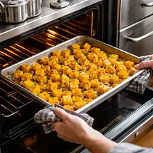 Wstaw blachę z dynią do nagrzanego piekarnika. Piecz przez 25-30 minut. W połowie pieczenia (po ok. 15 minutach) przemieszaj dynię łopatką, aby równomiernie się zarumieniła. Dynia jest gotowa, gdy widelec wchodzi w nią z łatwością, a krawędzie są lekko zbrązowiałe i skarmelizowane. Po upieczeniu wyjmij blachę z piekarnika i odstaw do lekkiego przestudzenia.