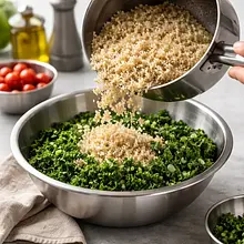 Wsyp komosę ryżową na drobne sitko. Płucz ją bardzo dokładnie pod zimną, bieżącą wodą przez około minutę, mieszając ręką. Ten krok jest kluczowy, aby pozbyć się saponin – naturalnej powłoki, która nadaje komosie gorzkawy posmak.