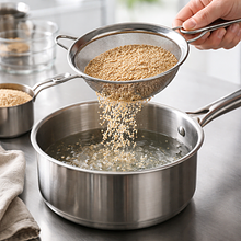Do średniego rondla wsyp przepłukaną quinoa (200 g) i zalej 400 ml zimnej wody (stosunek 1:2). Doprowadź do wrzenia na dużym ogniu, potem zmniejsz ogień do małego, przykryj pokrywką i gotuj 12-15 minut, aż quinoa wchłonie wodę i stanie się przezroczysta z charakterystycznym białym oczkiem (kiełkiem) wychodzącym z ziarenka. Po ugotowaniu zdejmij rondel z ognia i odstaw na 5 minut pod przykryciem, następnie rozdziel widelcem, aby ziarna się rozdzieliły i lekko przestygły.