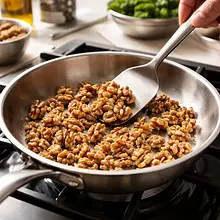Na średniej patelni (bez tłuszczu) praż orzechy włoskie na średnim ogniu przez 2–3 minuty, potrząsając patelnią co kilkanaście sekund, aż zaczną wydzielać aromat i lekko się zrumienią. Przełóż na talerz, aby przestały się prażyć od resztkowego ciepła i po ostudzeniu grubo posiekaj nożem.