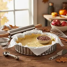 Użyj formy do tarty z wyjmowanym dnem o średnicy 24-26 cm. Jeśli ciasto pęknie podczas przenoszenia, nie martw się - po prostu 'załataj' dziurę kawałkiem ciasta, sklejając je w formie. Dno formy nakłuj widelcem w kilku miejscach, aby para wodna miała ujście.