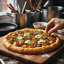 Ta jesienna tarta to kwintesencja sezonowych smaków, idealna na chłodne wieczory. Kruchy, maślany spód wypełniony jest aksamitnym, lekko słodkim musem z pieczonej dyni Hokkaido, który doskonale komponuje się z intensywnym, ziemistym aromatem leśnych grzybów. Całość przełamana jest charakterystyczną, kremową i lekko kwaskowatą nutą koziego sera, który po zapieczeniu tworzy apetyczne, złociste plamy na powierzchni. Dodatek świeżego tymianku i gałki muszkatołowej podkreśla głębię smaku i dodaje potrawie elegancji. Tarta prezentuje się niezwykle apetycznie dzięki kontrastowi pomarańczowego nadzienia i ciemniejszych grzybów. Jest to danie, które sprawdzi się zarówno jako wykwintny obiad, danie główne na spotkaniu z przyjaciółmi, jak i sycąca kolacja. Można ją podawać na ciepło, w towarzystwie prostej sałatki z rukoli i winegretu, co stworzy zbilansowany i pełny posiłek.