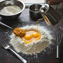 Na czystym, dużym blacie lub stolnicy wysyp 400g mąki, tworząc z niej kopczyk. Na środku kopca zrób palcami duże wgłębienie, przypominające krater wulkanu. Wsyp do wgłębienia 2 szczypty soli. Upewnij się, że 'ściany' krateru są wystarczająco wysokie, aby płynne składniki nie wypłynęły na zewnątrz.
