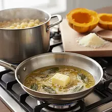 W międzyczasie, gdy makaron się gotuje, przygotuj sos. Na dużej patelni na średnim ogniu rozpuść 80g masła. Gdy masło się rozpuści i zacznie pienić, dodaj całe liście szałwii i lekko zmiażdżone ząbki czosnku. Podgrzewaj, mieszając od czasu do czasu, przez około 3-4 minuty. Obserwuj uważnie – masło zacznie brązowieć, a w kuchni pojawi się intensywny, orzechowy zapach. Liście szałwii staną się chrupiące. Zdejmij patelnię z ognia, gdy tylko masło osiągnie bursztynowy kolor. Jeśli używasz orzechów, możesz je teraz wrzucić na patelnię i lekko podprażyć.