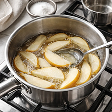 Gotowanie syropu: włóż do średniego rondla pokrojone gruszki, 80 g cukru, 250 ml wody, pokrojony na plasterki imbir (20 g) i 1 laskę cynamonu (6 g). Postaw rondel na średnim ogniu, doprowadź do delikatnego wrzenia, po czym zmniejsz ogień i gotuj na małym ogniu przez 12-15 minut, mieszając co 2-3 minuty. Owoc powinien zmięknąć (sprawdź widelcem — powinien łatwo wchodzić) a płyn lekko zgęstnieć. Syrop jest gotowy gdy płyn zaczyna pokrywać łyżkę i pozostawiać cienką warstwę.