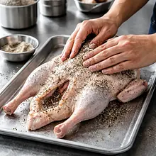 Wyjmij kaczkę z lodówki na 30 minut przed przygotowaniem, by mięso osiągnęło temperaturę pokojową. Jeśli tuszka ma podgardle i wnętrzności w worku — usuń je i przechowaj do wykorzystania w bulionie. Osusz kaczkę dokładnie ręcznikami papierowymi (wewnątrz i na zewnątrz). Zewnętrzną warstwę skóry delikatnie nakłuj cienką igłą lub końcem ostrza w wielu miejscach (tylko skórę, nie mięso) na odległości 1-1,5 cm — to ułatwi wytopienie tłuszczu.