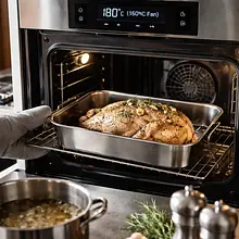 Nagrzej piekarnik do 180°C (termoobieg 160°C jeśli używasz termoobiegu). Umieść kaczkę piersią do góry na kratce nad brytfanną (jeśli masz) lub bezpośrednio w brytfannie. Piecz przez pierwsze 20 minut na pełnej mocy, następnie zmniejsz temperaturę do 170°C i piecz 100–110 minut (łączny czas około 2 godzin dla tuszki 1,8 kg). Co 20–25 minut polewaj kaczkę wytapiającym się tłuszczem (zbieraj go łyżką i rozprowadzaj po skórze), aby skórka równomiernie się zrumieniła. Kaczka jest gotowa, gdy temperatura wewnętrzna w udzie osiągnie 75°C i sok wypływający po nakłuciu mięśnia jest przejrzysty (nie różowy). Po wyjęciu z piekarnika odstaw kaczkę na deskę na 15 minut pod luźnym folią aluminiową — mięso 'odpocznie' i soki równomiernie się rozdzielą.