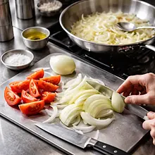 Podsmaż cebulę do karmelizacji: obierz cebulę i pokrój w cienkie piórka (pomidory jak półksiężyce). Rozgrzej patelnię o średnicy 24-28 cm na średnim ogniu, dodaj 15 g masła. Włóż cebulę i smaż, mieszając drewnianą łyżką, przez 12-15 minut aż cebula zmięknie i zacznie nabierać złotobrązowego koloru. Na końcu dodaj 20 g cukru i smaż kolejne 2-3 minuty, aż cukier się rozpuści i cebula stanie się lekko karmelizowana.